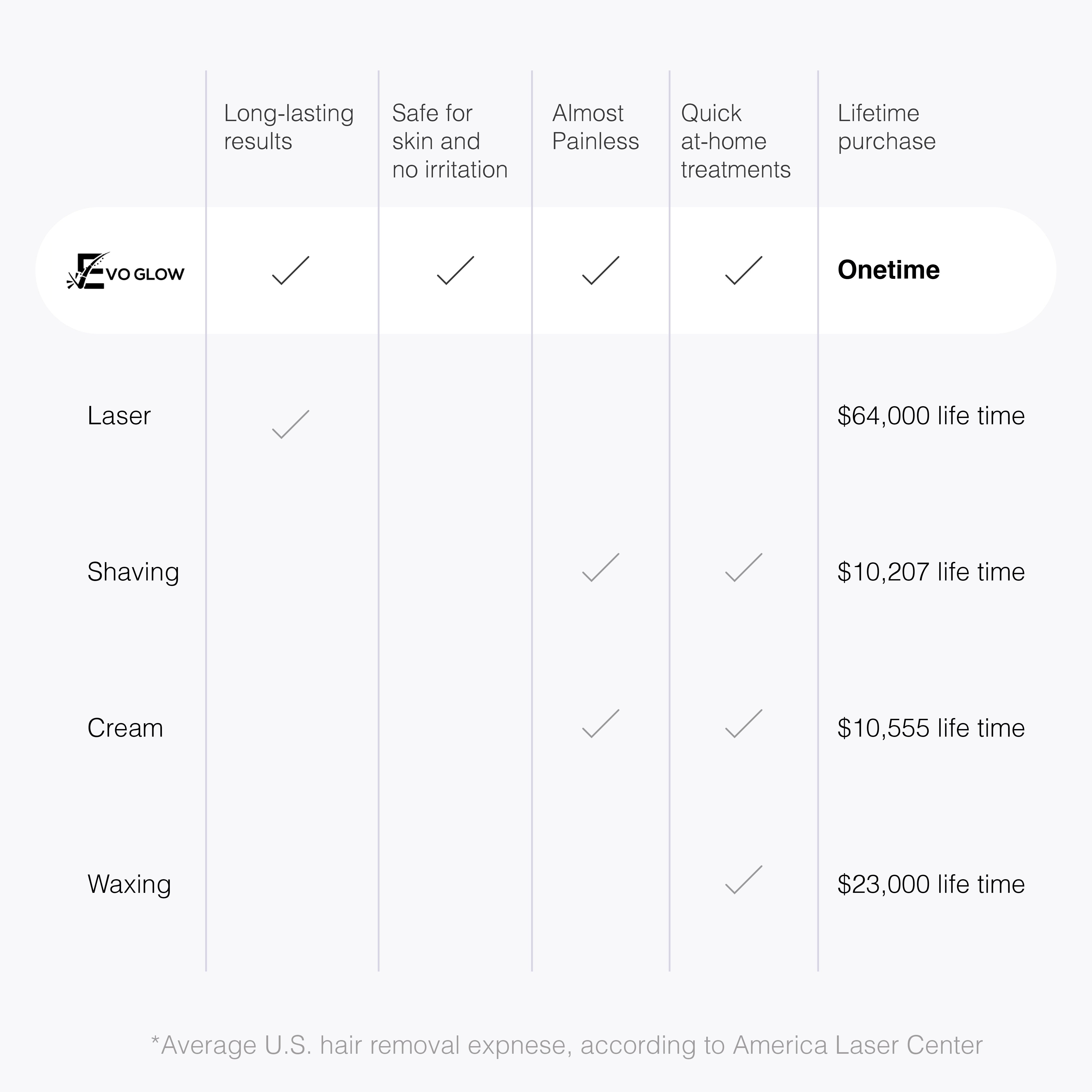 EVO Glow IPL offers a one-time investment for smooth, hair-free skin without the high ongoing costs of traditional methods. Skip the $64,000 expense of laser treatments and the repeated costs of shaving, creams, or waxing. With EVO Glow, you get safe, painless, and effective results at home—saving both your time and money for a lifetime of confidence.